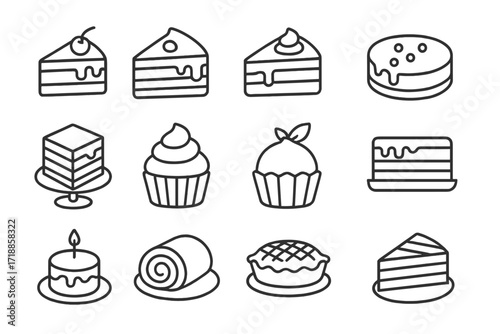 Cake and Pastry Thin Line Icons Set, Editable Stroke Vector Collection with Cupcake, Pie, Layered Slice, Dessert Roll, Birthday Cake, Suitable for Web, Print, Cards, Transparent Background
