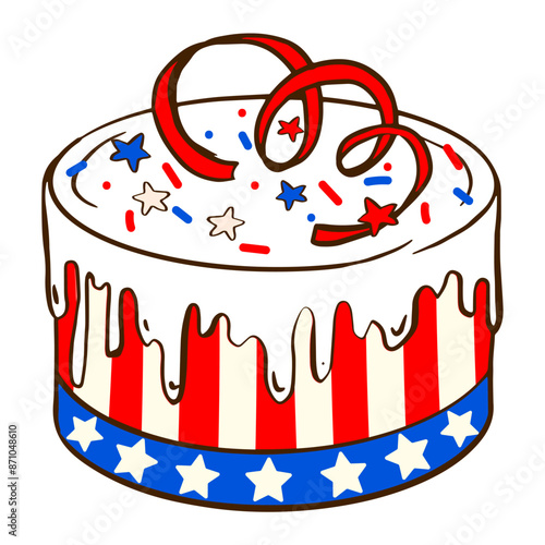 Cake colored in national colors of USA flag for decoration, posters, invitations, menus, banners. US Independence Day elements