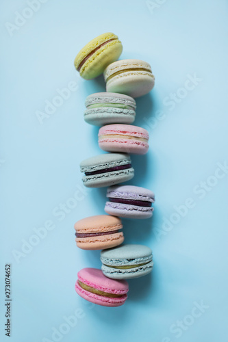 Cake macaron or macaroon on pastel blue background from above. Colorful almond cookies of pastel colors. Top view.