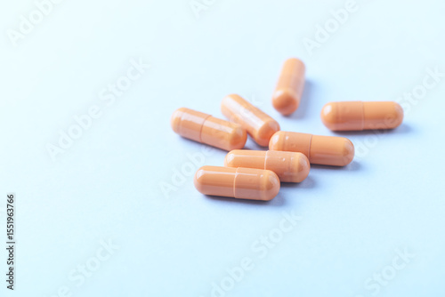 Calcium carbonate capsules. Bright paper background. Soft focus. Close up. Copy space