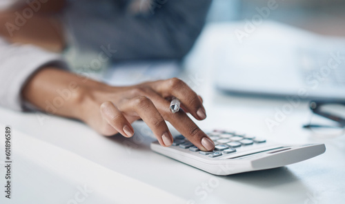 Calculator, accounting and woman hand working on finance investment report in office. Professional, taxes and closeup of female financial advisor doing calculation for asset management in workplace.