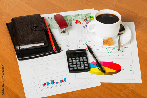 Calculator, cup coffee, notebooks and other stationery to desktop background.