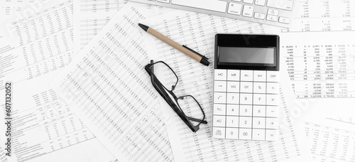 Calculator, keyboard and eyeglasses lying on financial statement . Financial concept.