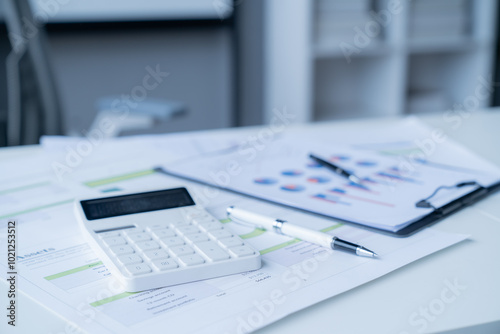 Calculator sitting on financial documents with charts and graphs, suggesting an accountant is performing calculations and analyzing financial data