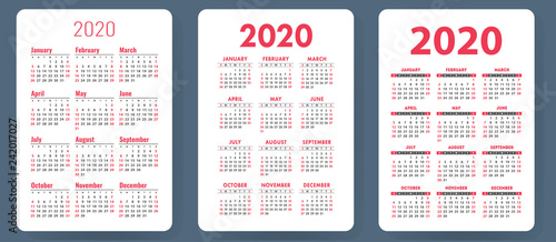 Calendar 2020. Colorful set. Week starts on Sunday. Basic grid