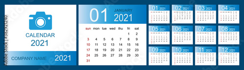 Calendar 2021, Set Desk Calendar template design with Place for Photo and Company Logo. Week Starts on Sunday. Isolated vector illustration