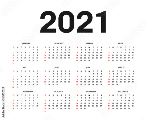 Calendar 2021 template. Calendar template in black and white colors, holidays in red colors