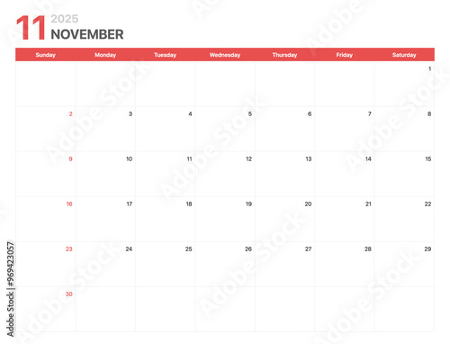 Calendar 2025. Calendar week 2025 starts on Sunday. Corporate minimalist clean calendar for November 2025