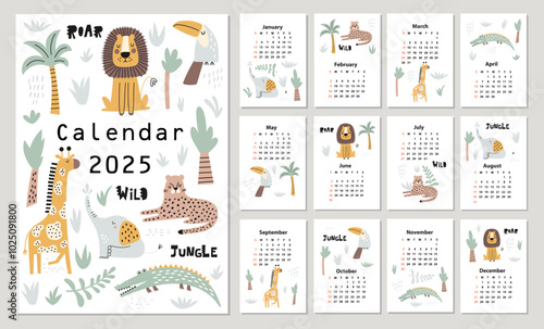 Calendar 2025 with tropical animals. Hand drawn vector illustration