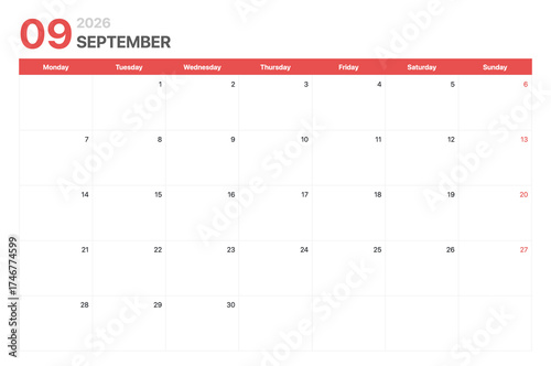 Calendar 2026. Calendar week 2026 starts on Monday. Corporate minimalist clean calendar for September 2026