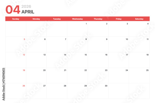 Calendar 2026. Calendar week 2026 starts on Sunday. Corporate minimalist clean calendar for April 2026