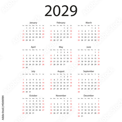 Calendar 2029 year icon in flat style. Planner vector illustration on isolated background. Calender sign business concept.