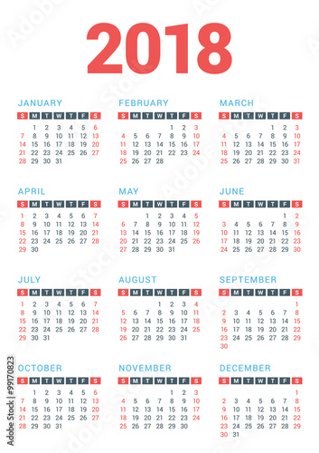 Calendar for 2018 Year on White Background. Week Starts Sunday. Vector Design Print Template