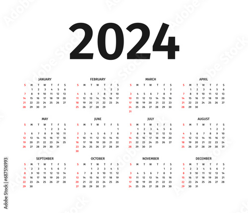 Calendar for 2024 year. Calendar template, layout in black and white colors. Annual 2024 calendar mockup on white background. Week starts on Sunday. Vector