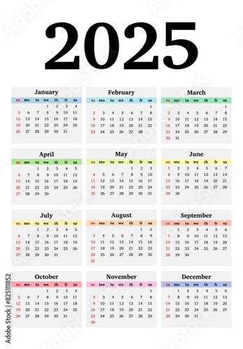 Calendar for 2025 isolated on a white background