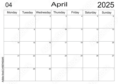 calendar for April 2025 in English. Monthly Organizer. 2025 Monthly Planner