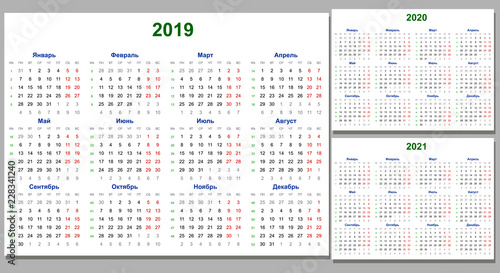 Calendar grid for 2019, 2020 and 2021 years set. Simple horizontal template in Russian language. Two days off - Saturday and Sunday. Vector illustration