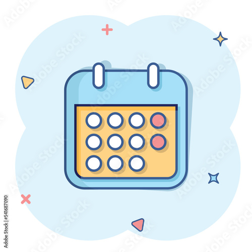 Calendar icon in comic style. Agenda cartoon vector illustration on white isolated background. Schedule planner splash effect business concept.
