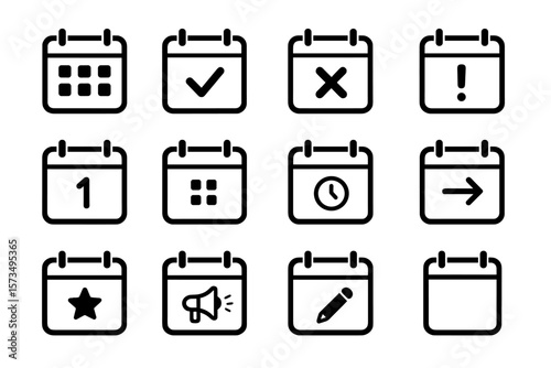 Calendar icon set for web and mobile app UI design. Vector planner symbols for business schedule, event reminder, date organizer, deadline appointment. Line pictogram collection.