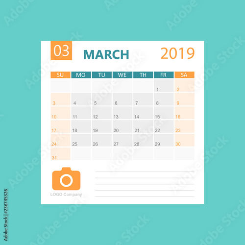 Calendar march 2019 year in simple style. Calendar planner design template. Agenda monthly march template with company logo. Business vector illustration.