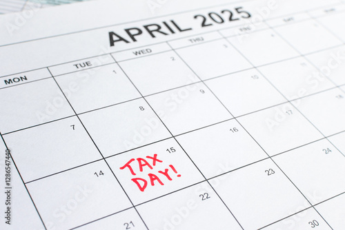 Calendar of April 2025, with Tax Day reminder on the 15th. Deadline for filing Individual Income Tax Return and Corporate Tax Return. Taxation, tax season, tax reminder, regulatory filing concept