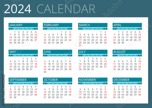 Calendar planner for 2024. Colorful wall calendar in English on a white background. Calendar template for 2024. Corporate and business calendar 24. Week Starts on Sunday