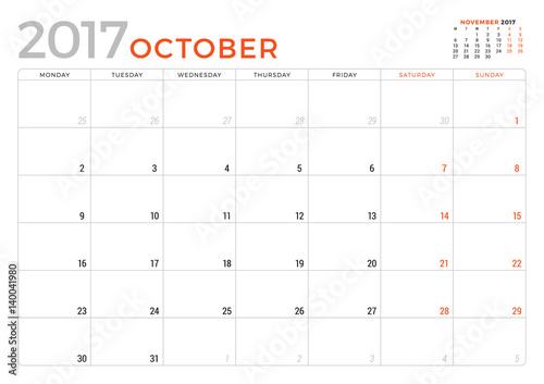 Calendar Planner for October 2017 Year. Vector Design Template. Week Starts Monday. Stationery Design