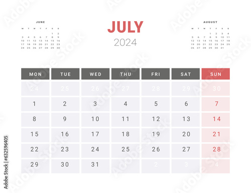 Calendar Template of july 2024. Vector layout simple calendar with week start Monday.