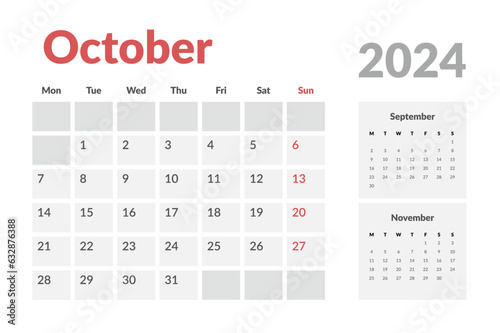 Calendar Template of october 2024. Vector layout simple calendar with week start Monday.
