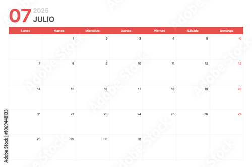 Calendario 2025. La semana del calendario 2025 comienza el lunes. Calendario minimalista y corporativo limpio para Julio 2025