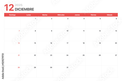Calendario 2025. La semana del calendario 2025 empieza el domingo. Calendario corporativo minimalista limpio para Diciembre 2025