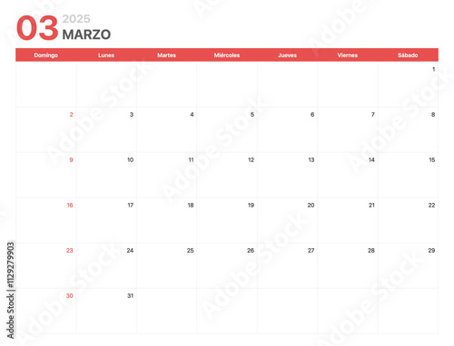 Calendario 2025. La semana del calendario 2025 empieza el domingo. Calendario corporativo minimalista limpio para Marzo 2025