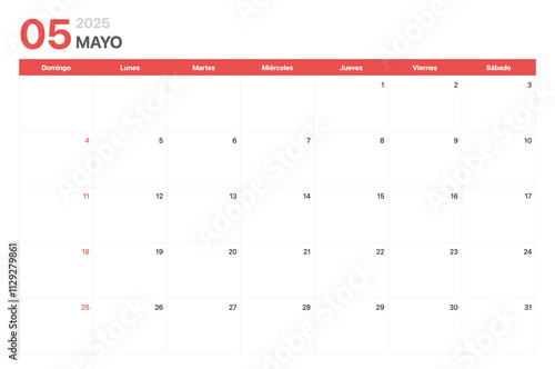Calendario 2025. La semana del calendario 2025 empieza el domingo. Calendario corporativo minimalista limpio para Mayo 2025