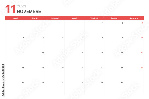 Calendrier 2024. La semaine du calendrier 2024 commence le lundi. Calendrier minimaliste d'entreprise propre pour Novembre 2024