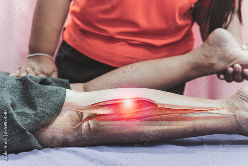 Calf pain treatment, leg stretching, calf muscle cramped, massage and physiotherapy treatment, physiotherapist doing leg stretching, health care concept