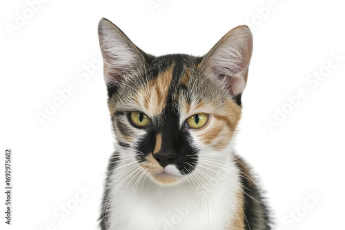 Calico Cat Close-Up Portrait with Green Eyes and Distinctive Fur Pattern – Photorealistic Pet PNG on Transparent Background