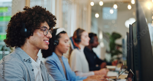 Call center agent, man and happy in office as customer service professional in sales company. Male person, headset and consultant in telemarketing agency as cheerful, smiling and employee in business