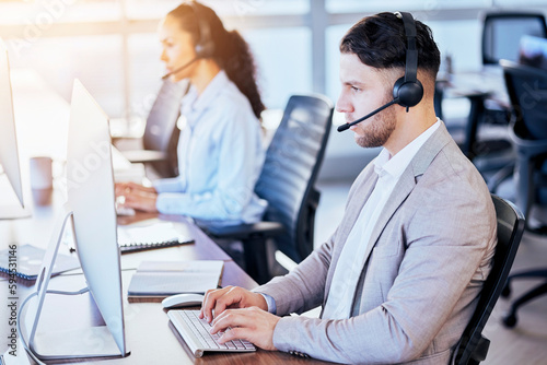 Call center, computer and typing man in office for customer service, technical support and help desk. Telemarketing, contact us and communication with employee for sales advice, operator or crm focus