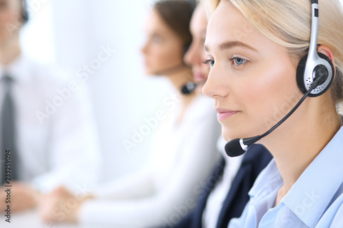 Call center. Group of operators at work. Focus at blonde business woman in headset