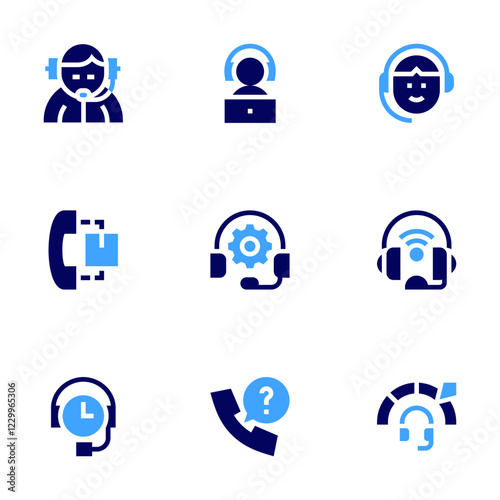 Call center icon set. Bold style. Duotone colors. streamer, online support, settings, helpline, question, customer service agent, headset, positive review, hours support