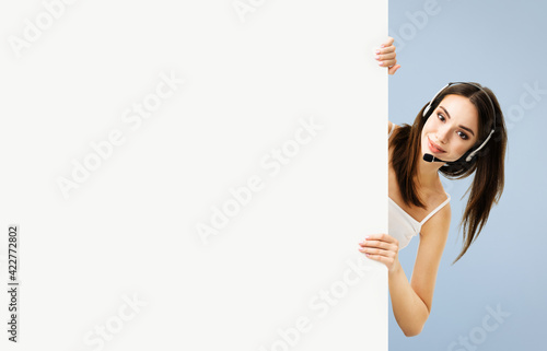 Call Center Service. Customer support or sales agent. Caller or receptionist phone operator showing empty banner with copy space area. Helping, answering, consulting. Grey color background.
