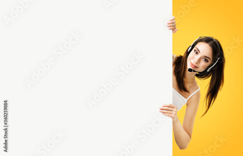 Call Center Service. Customer support or sales agent. Caller or receptionist phone operator showing empty banner with copy space. Helping, answering, consulting. Orange yellow color background.
