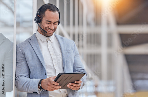 Call center, tablet and happy man typing in office for telemarketing, website help or crm in office. Support, contact us or customer service business consultant planning schedule or consulting online