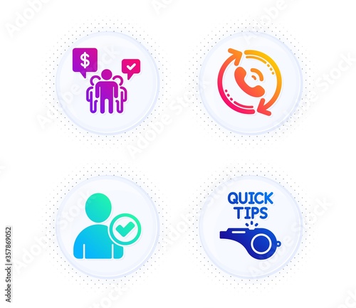 Call center, Teamwork and Identity confirmed icons simple set. Button with halftone dots. Tutorials sign. Recall, Employees chat, Person validated. Quick tips. Business set. Vector