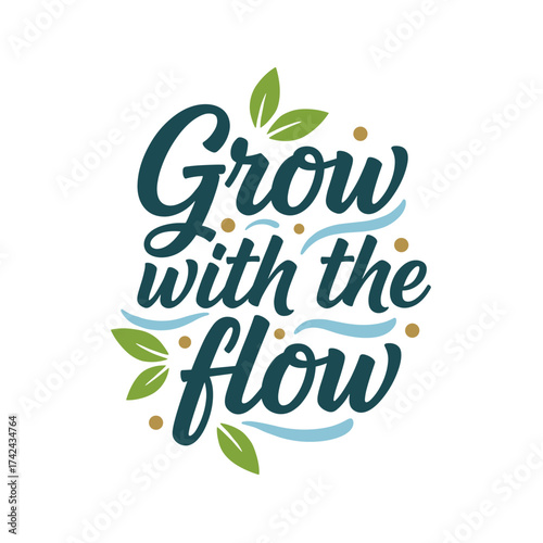 Calligraphic typography displays an encouraging message with flourishes and a delicate illustration of leaves and blue water ripples that represents constant change.