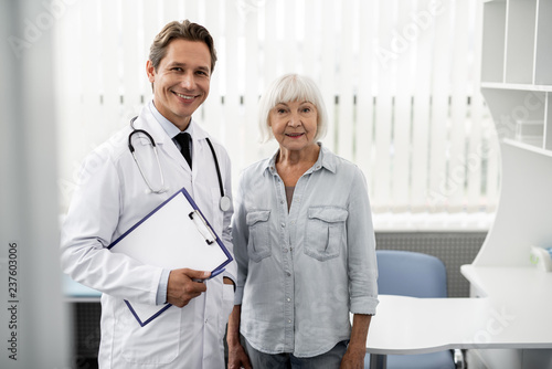 Calm aged woman standing next to her smiling general practitioner after consulting him in modern clinic
