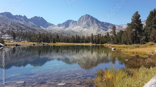 Calm alpine lake reflecting mountains under a clear sky.
