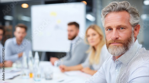 Calm and assertive business leader sharing insights in group meeting, conference room setup.