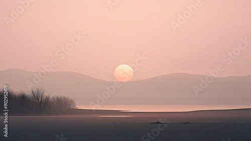 Calm and simple background (wallpaper) with delicate texture with mountains, trees, fog, sun, and moon.