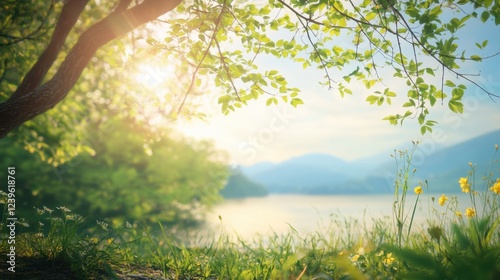 Calm morning by the lake with sunlight filtering through green leaves and mountains in the distance. Generative AI